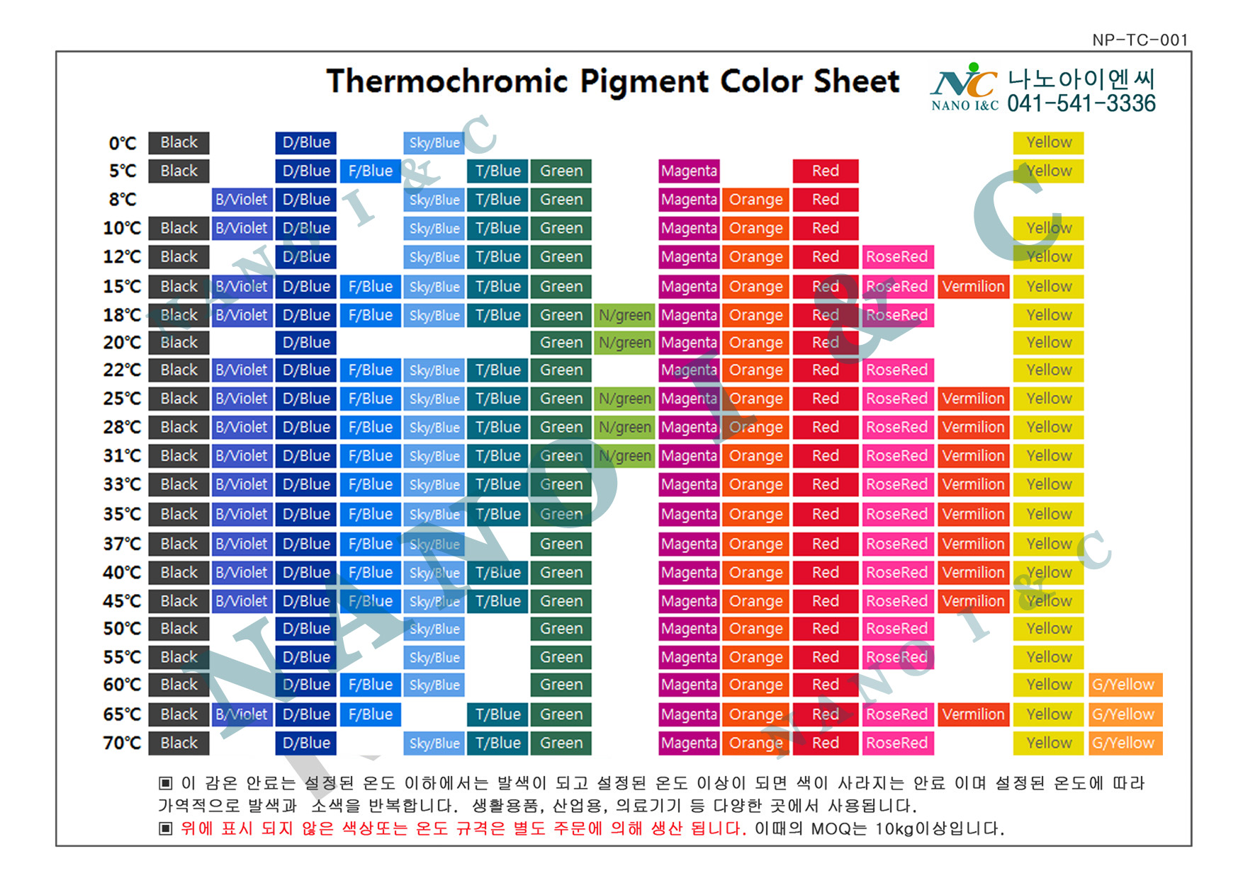 개요 : 감온색소(Thermochromic Micro Capsule)은 온도에 따라 색상이 변하는 안료로서 마이크로 캡슐 파우더타입과 액상 슬러리 타입이 생산